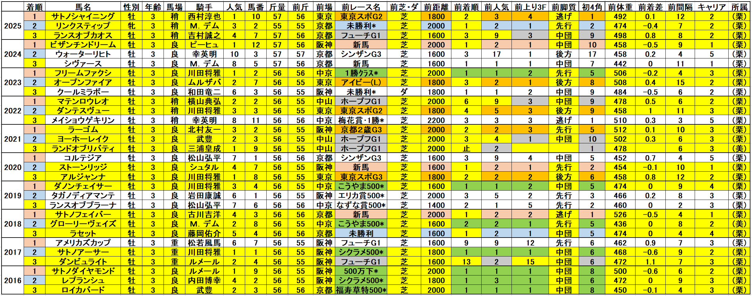 黄色部分は5番人気以内馬で、赤・青・緑・橙・灰色部分は強調部分として色分けしています。