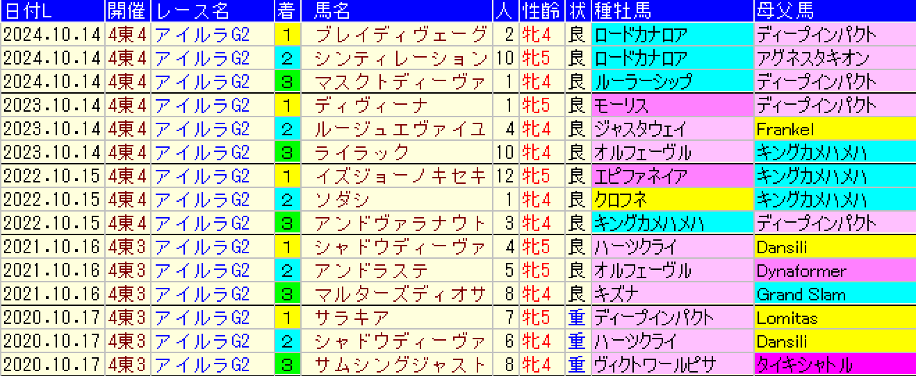 黄色部分は5番人気以内馬で、赤・青・緑色部分は強調部分として色分けしています。