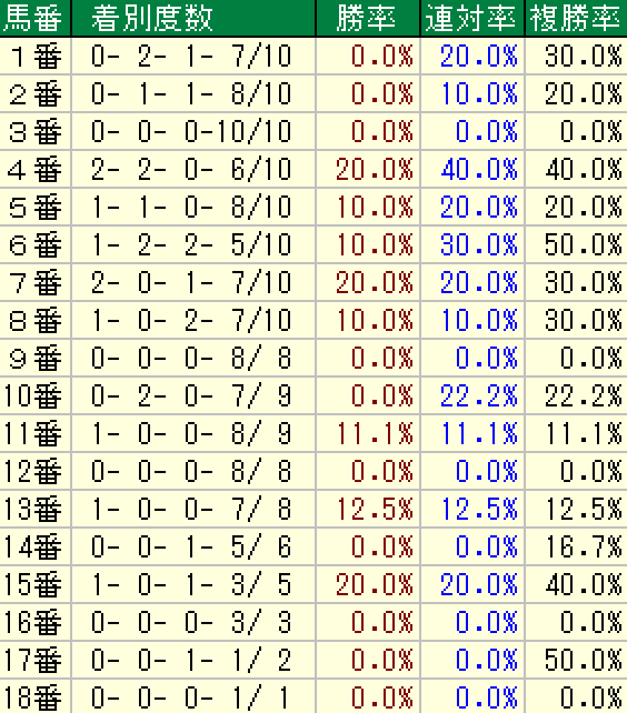 シンプルな条件ですが、この内訳は12・8・7・4・1・5・2・1人気で人気薄の好走が目立つこと。