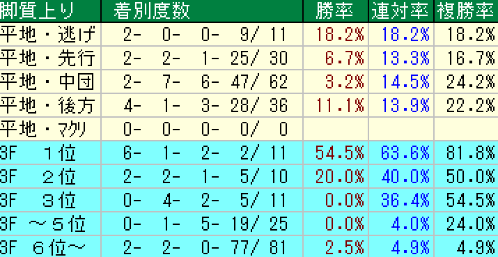 ・前走脚質逃げ(0・0・0・9)複勝率0%