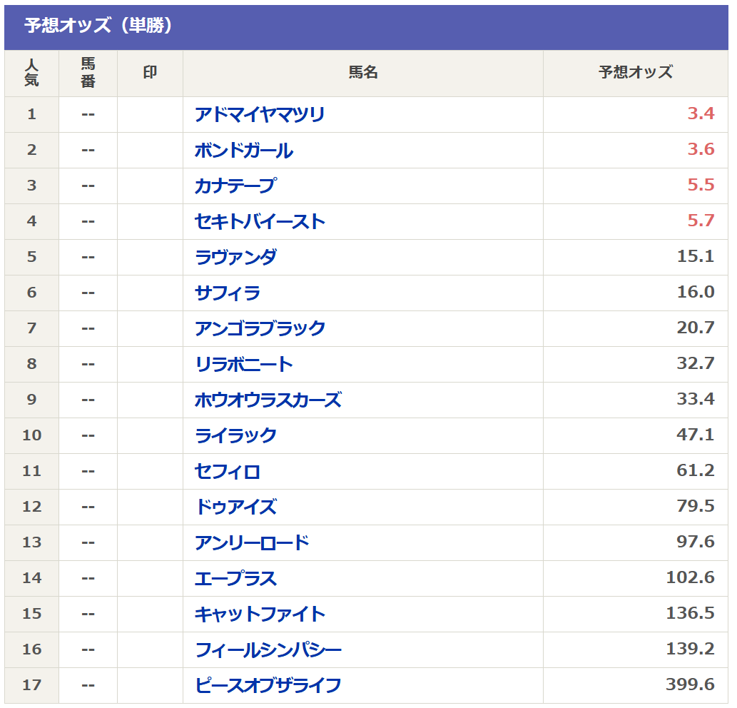 現時点の予想オッズを見ると4強構成となっているので、予想オッズ4番人気以内馬までを上位人気馬として扱います。