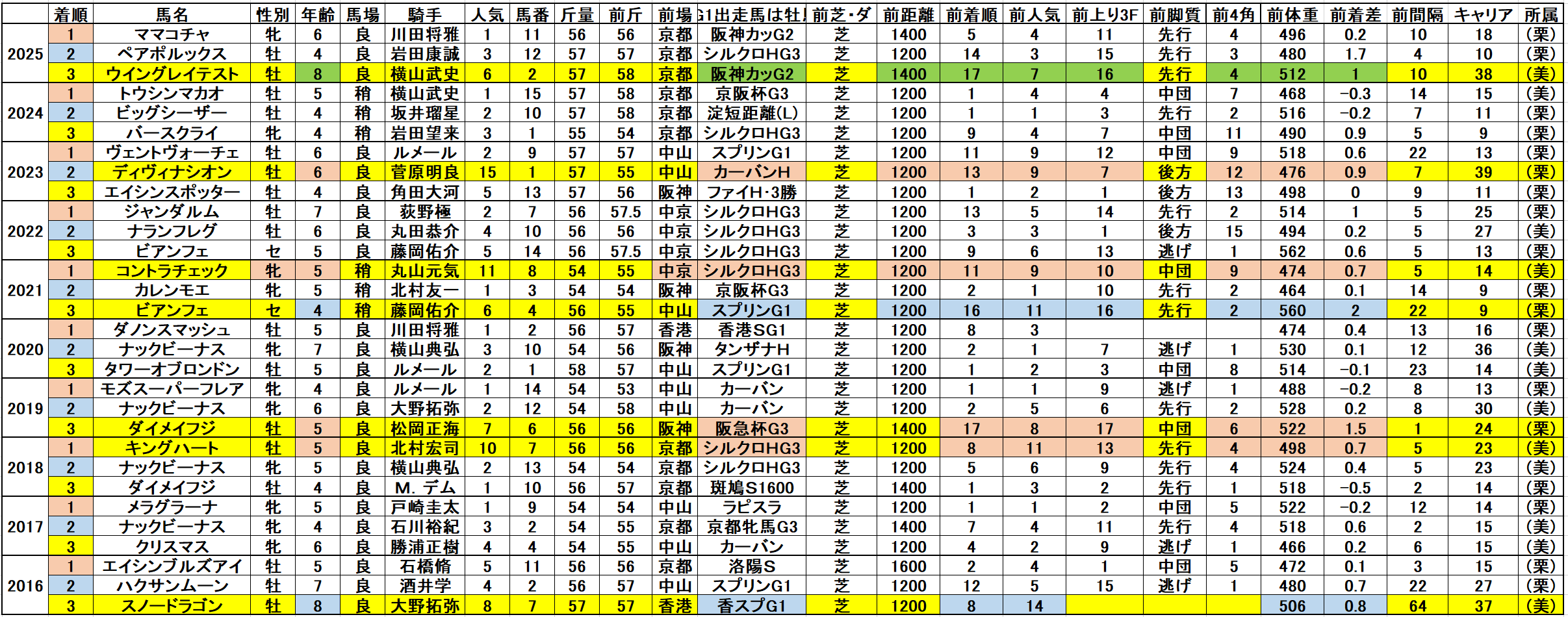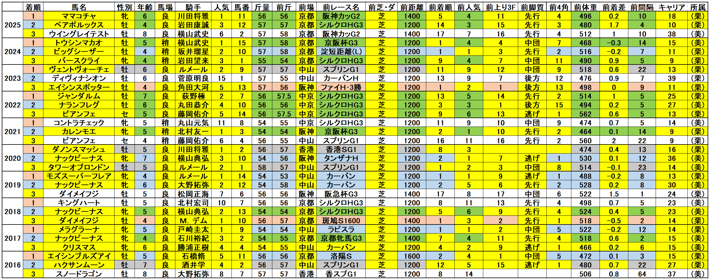 黄色部分は5番人気以内馬で、赤・青・緑・灰色部分は強調部分として色分けしています。
