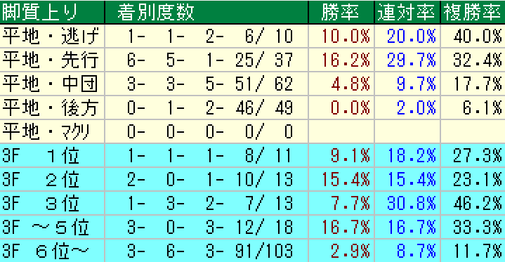 これを見ると基本的に前に行ける馬を選ぶのがベターでしょう。