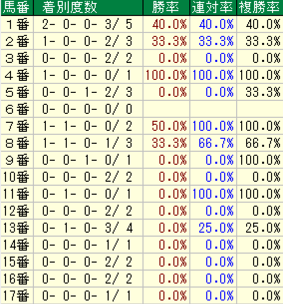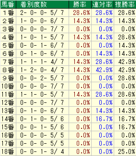 これを見ると中~外枠も好走馬はそれなりにいるが、勝ち馬7頭中6頭が8番ゲート以内で複勝率も優秀です。