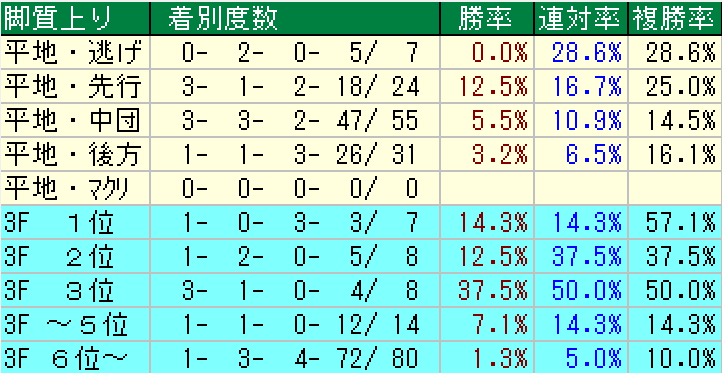 これを見ると開幕週なので当然前に行く馬の複勝率は悪くない。