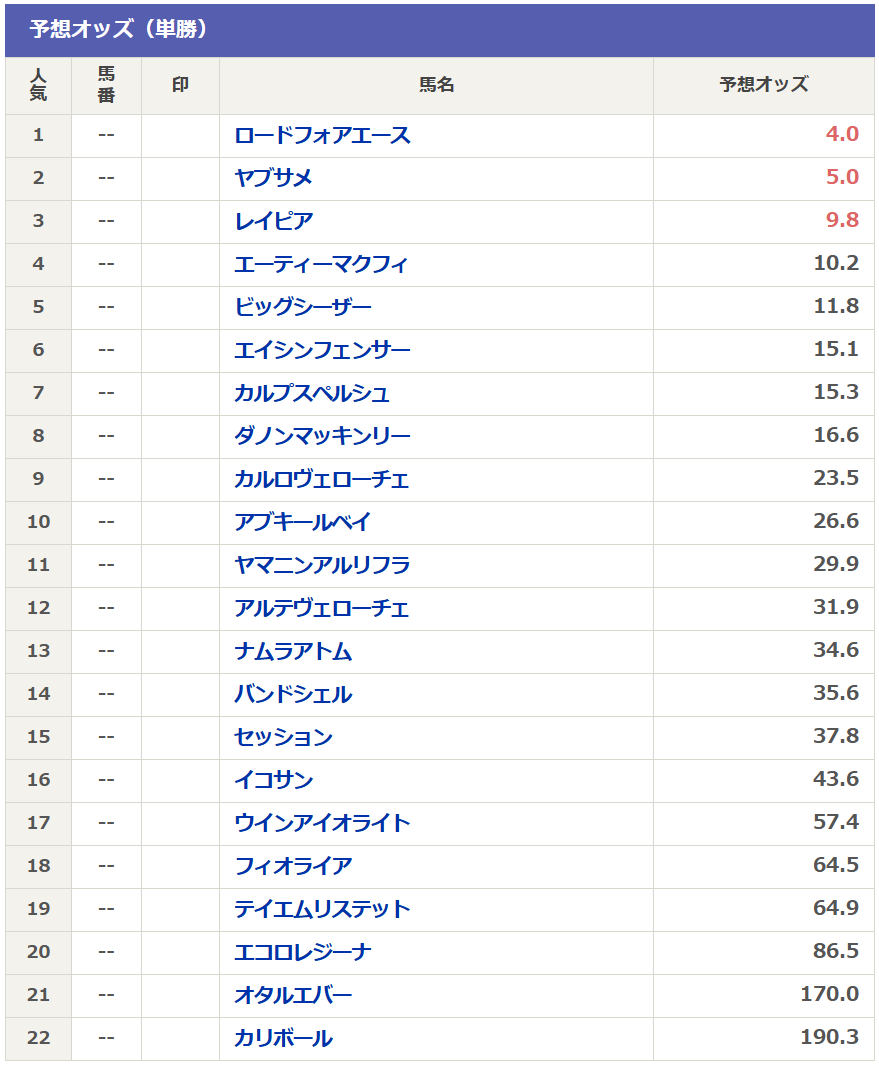 現時点の予想オッズを見るとビッグシーザーが5番人気ですが、6番人気のエイシンフェンサーの方が人気になる可能性も十分にありそう。