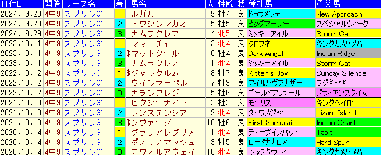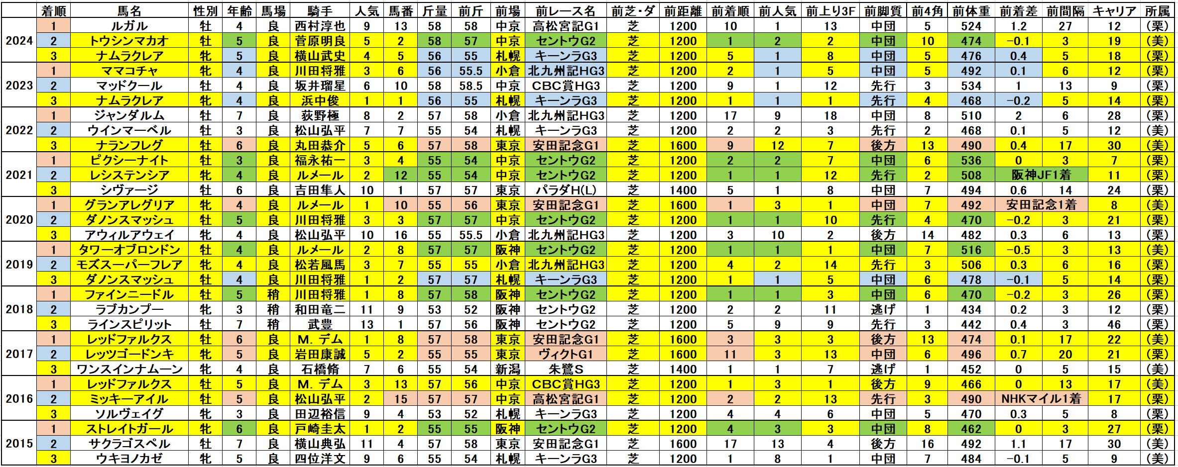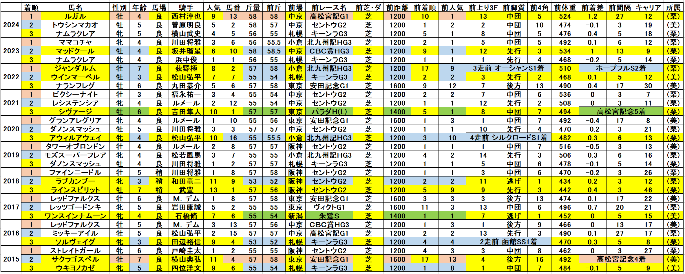 黄色部分は5番人気以内馬で、赤・青・緑色部分は強調部分として色分けしています。
