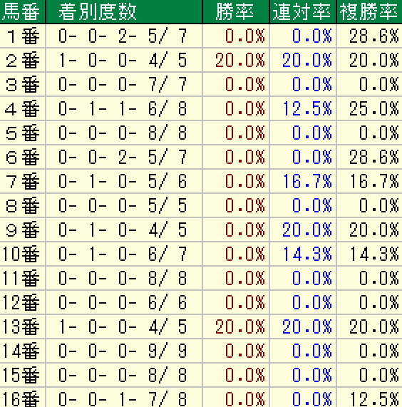 これを見ると外枠からも好走馬はいるが、明らかに内枠有利。