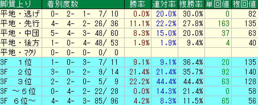 これを見ると追い込みも来ないことはないが3着までといった感じですね。