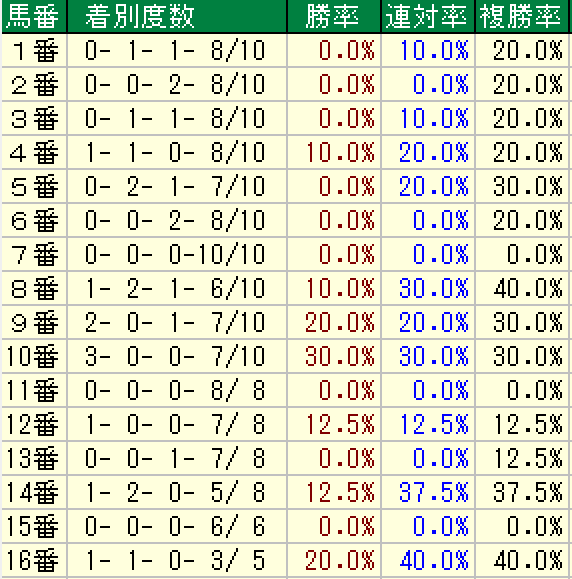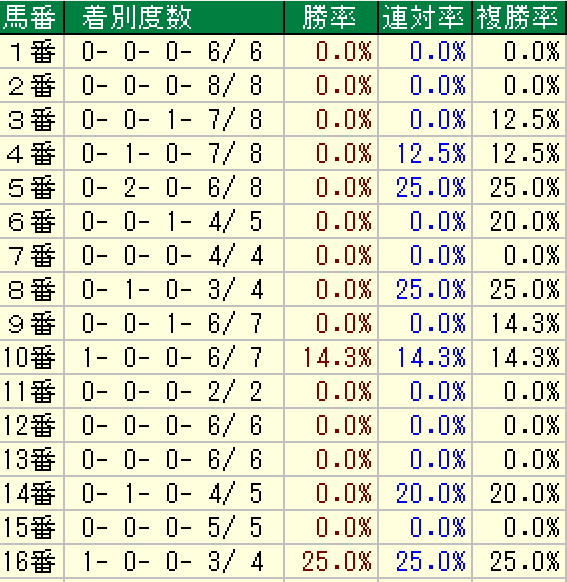 対象は過去10年の6番人気以下限定のもので、このレースの6番人気以下馬の複勝率は10,8%です。