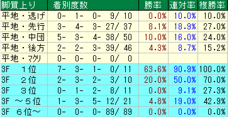 ・前走4角2~15番手以外(0・0・0・13)複勝率0%