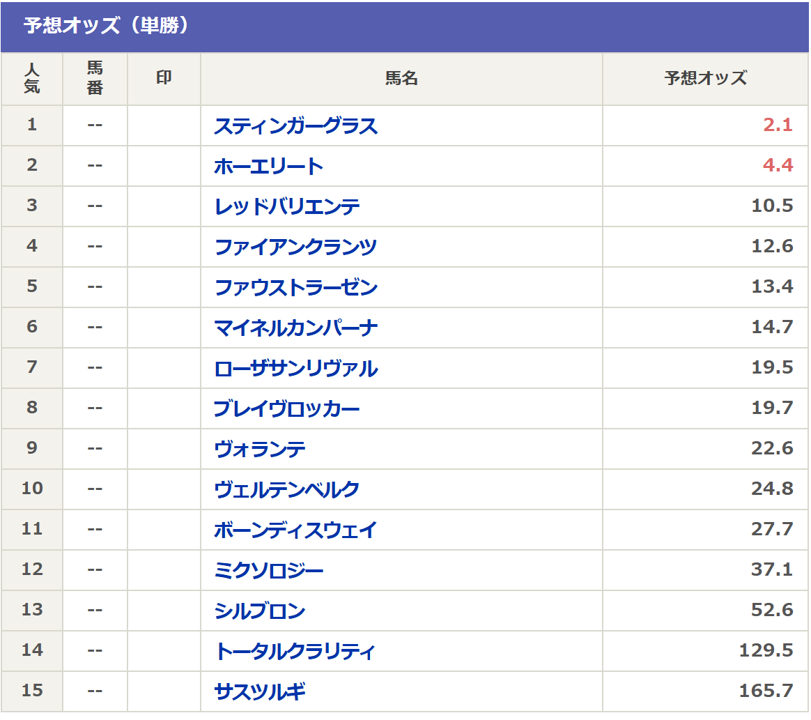 今年はスティンガーグラスとホーエリートの2強構成ですが、順当に決まりますかね?