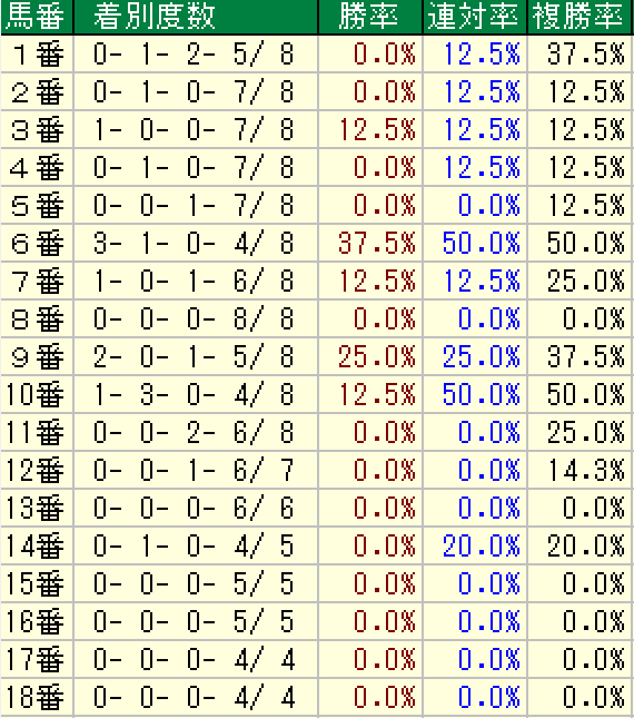 以下が開催時期が変更になった2018年以降の過去8年分の枠順傾向です。