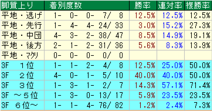 ・前走脚質追い込み(0・0・0・22)複勝率0%