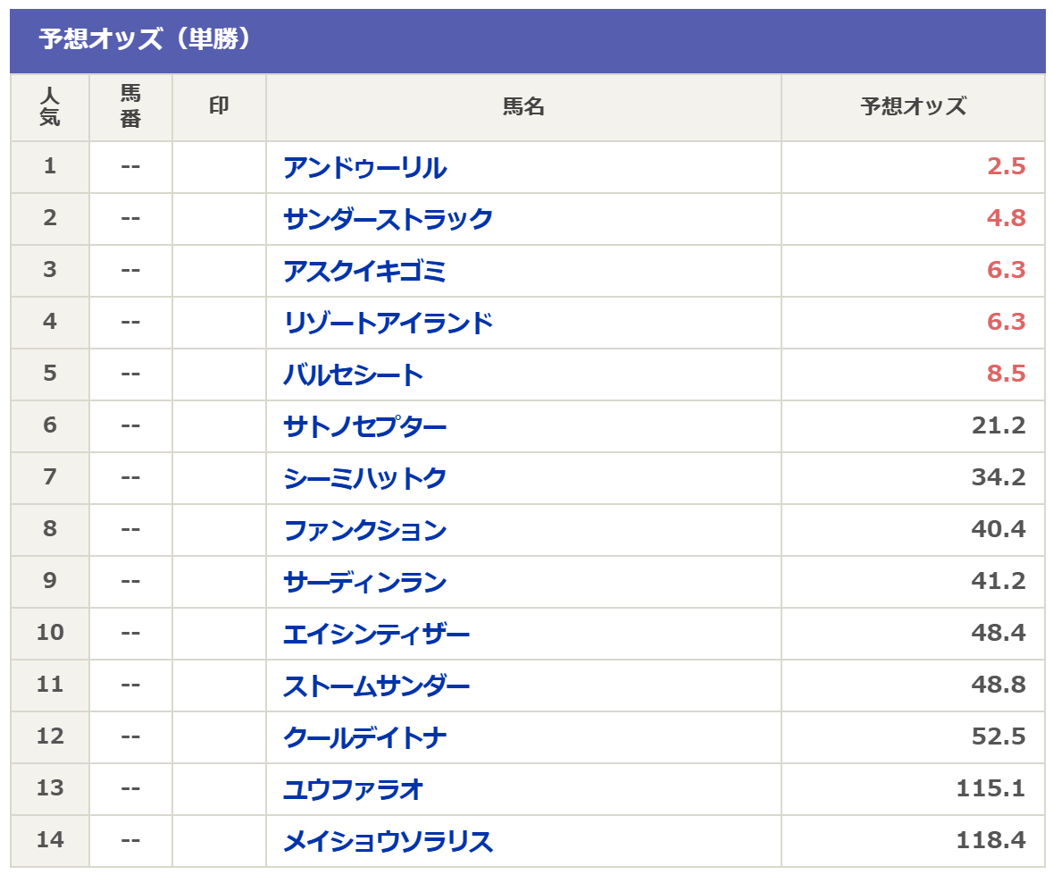 次いで先行候補はアンドゥーリル・クールデイトナ・サンダーストラック・ファンクション・ユウファラオ・リゾートアイランドとそこそこ揃っている。