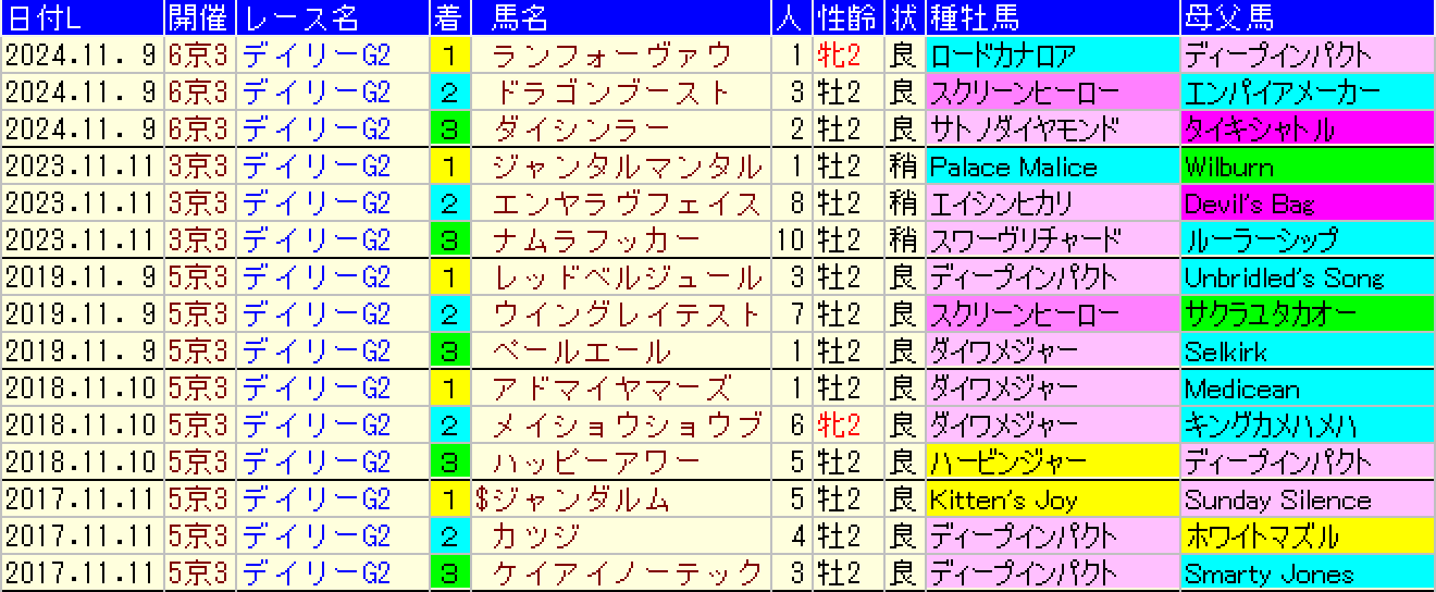 ディープインパクト産駒はもはやいませんが、大系統のヘイルトゥリーズン系とミスプロの組合せが好成績です。