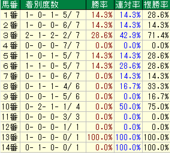 これを見ると勝ち馬は6番ゲート以内に多いが基本的に少頭数のレース。