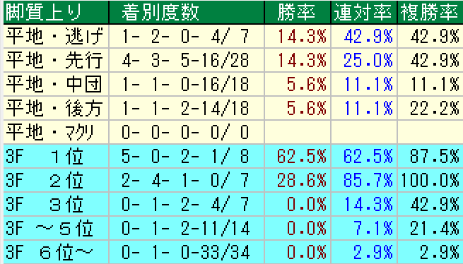 これを見ると逃げ・先行有利で上りは5位以内までが良さそう。