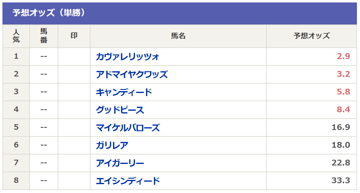 現時点の予想オッズを見ると4強構成になっているので予想オッズ4番人気以内馬を上位人気馬として扱います。