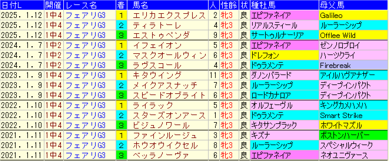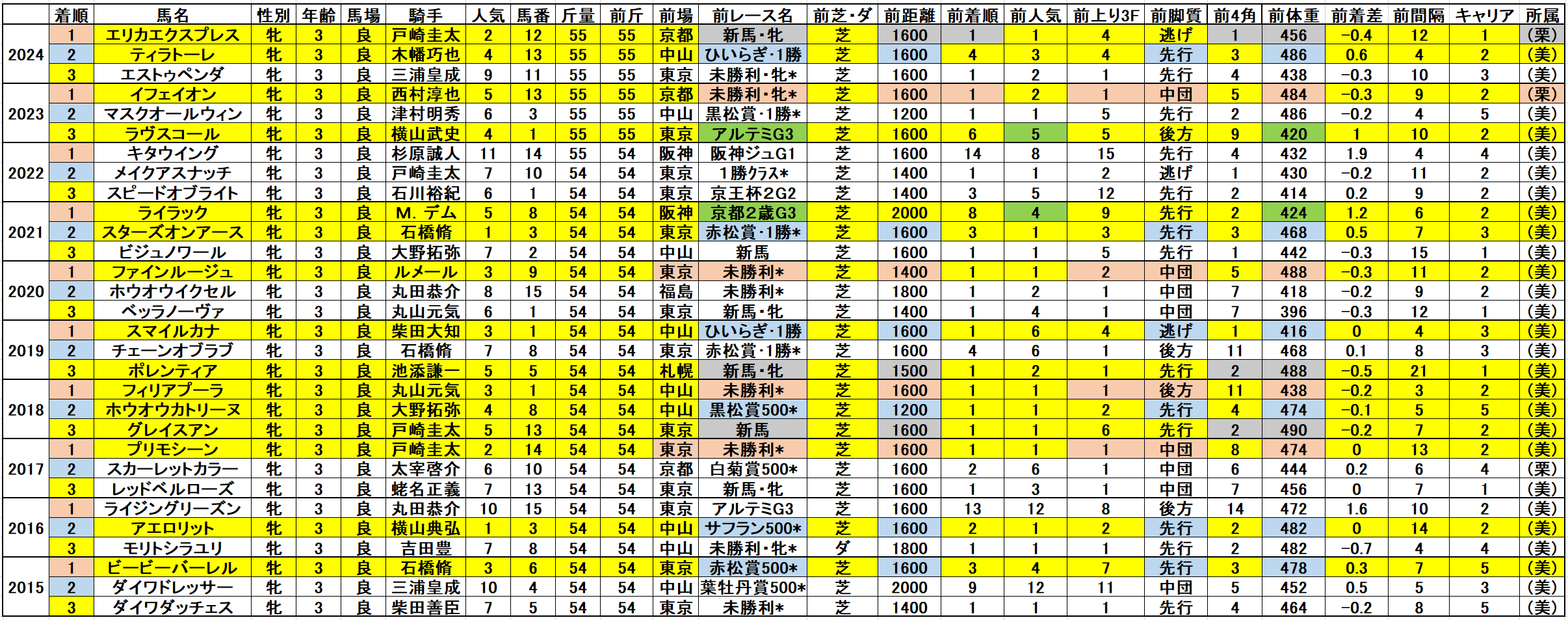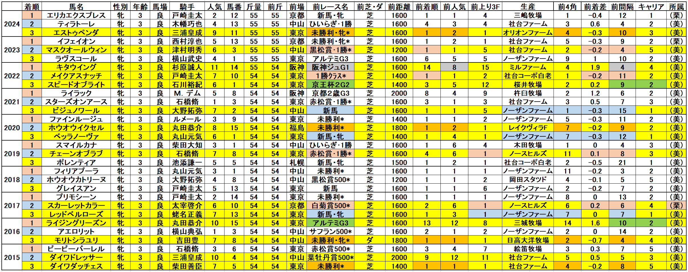 黄色部分は5番人気以内馬で、赤・青・緑・灰色部分は強調部分として色分けしています。