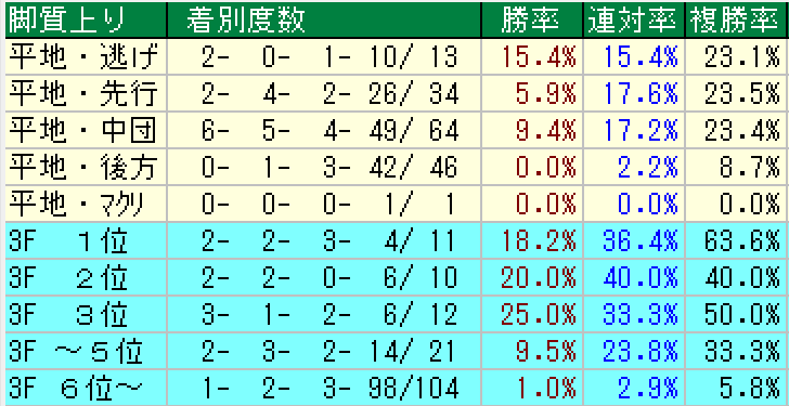 ・前走1勝クラス出走馬は前走4角6番手以内で上り5位以内(1・7・0・11)複勝率42,1%