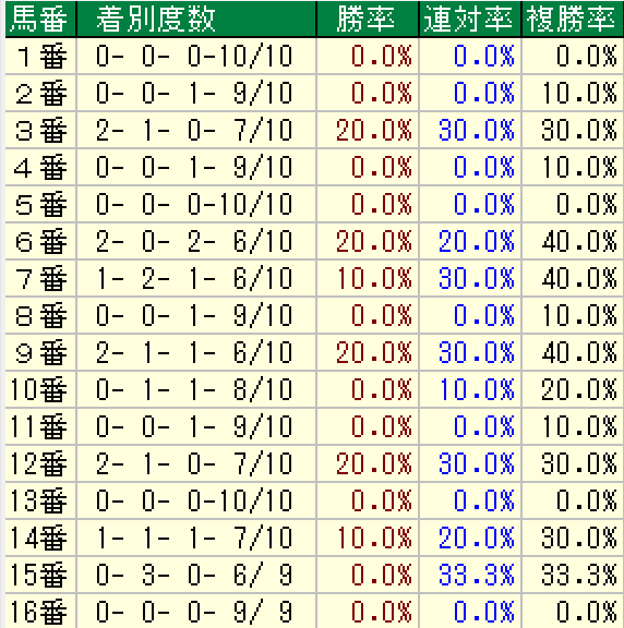 対象は過去10年の6番人気以下限定のもので、このレースの6番人気以下馬の複勝率は%です。