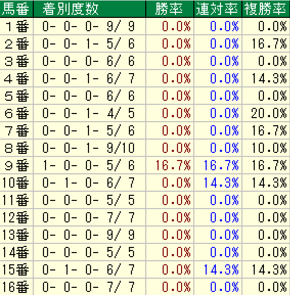 これを見るとコース形態的にも内枠不利なので1・2番ゲートの成績が悪い。