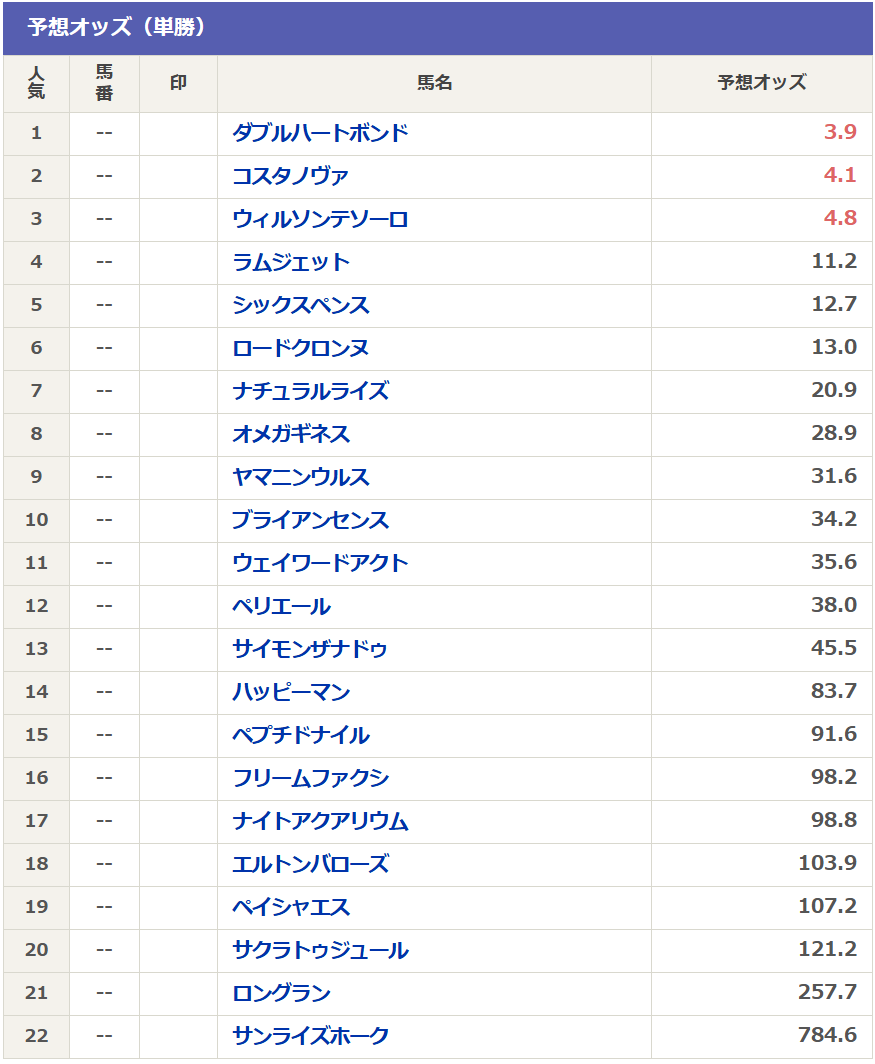 現時点の予想オッズを見ると6強構成となっているので、予想オッズ6番人気以内馬を上位人気馬として扱います。