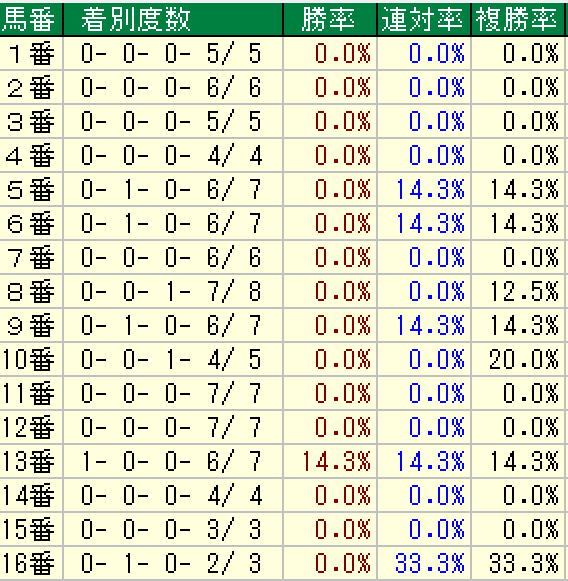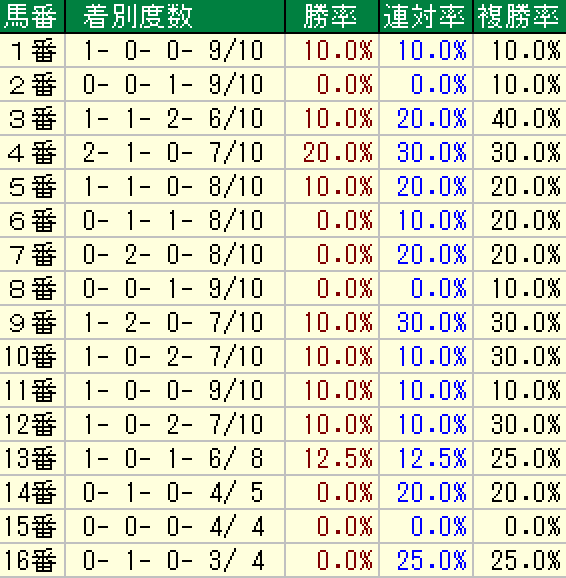 それ以外だと大外付近の成績はやや落ちるかなという程度。