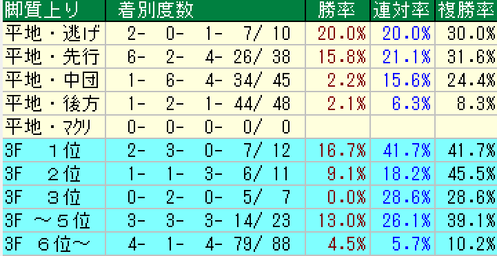 ・前走4角2~10番手以外(0・0・0・25)複勝率0%