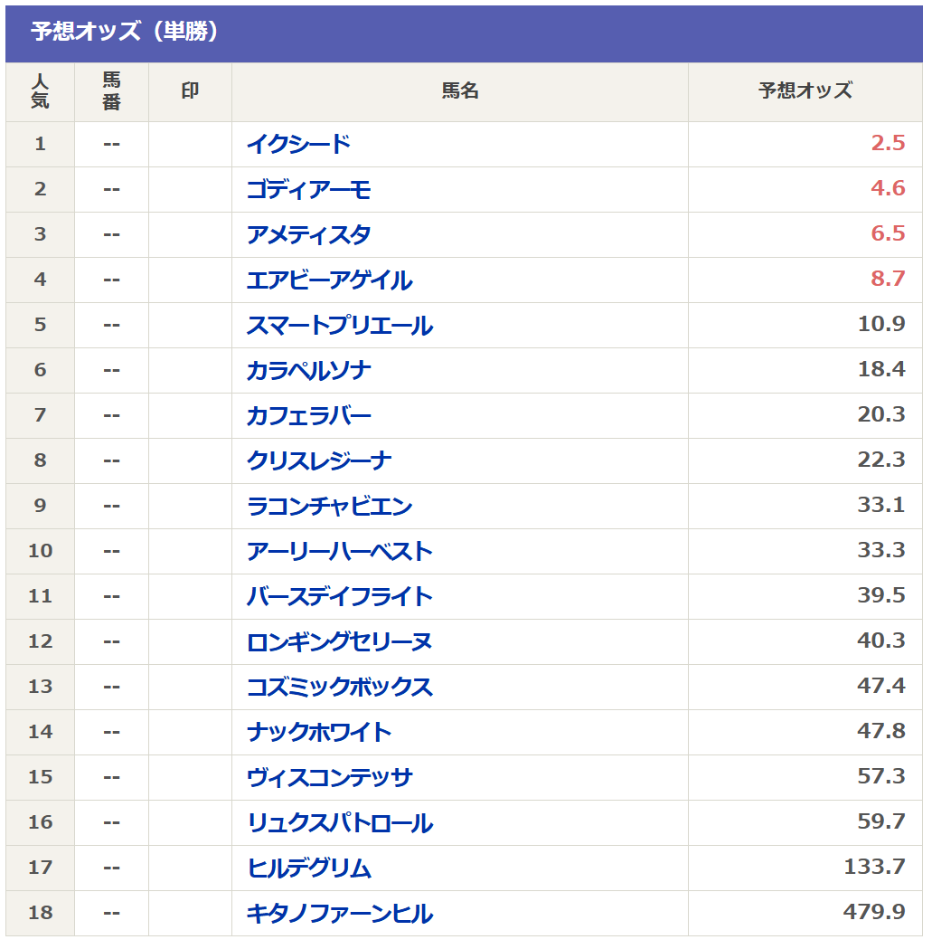 そして現在のnetkeibaさんの予想オッズは以下の通りです。
