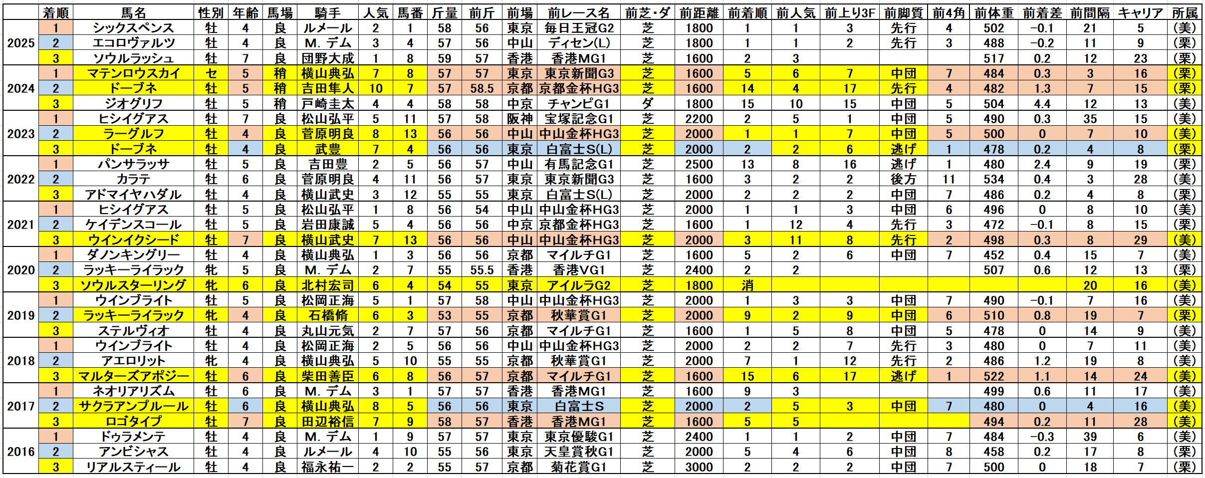次いでデータ面から注目すると前走除外のソウルスターリング、前走海外遠征馬を除く25頭中24頭が…