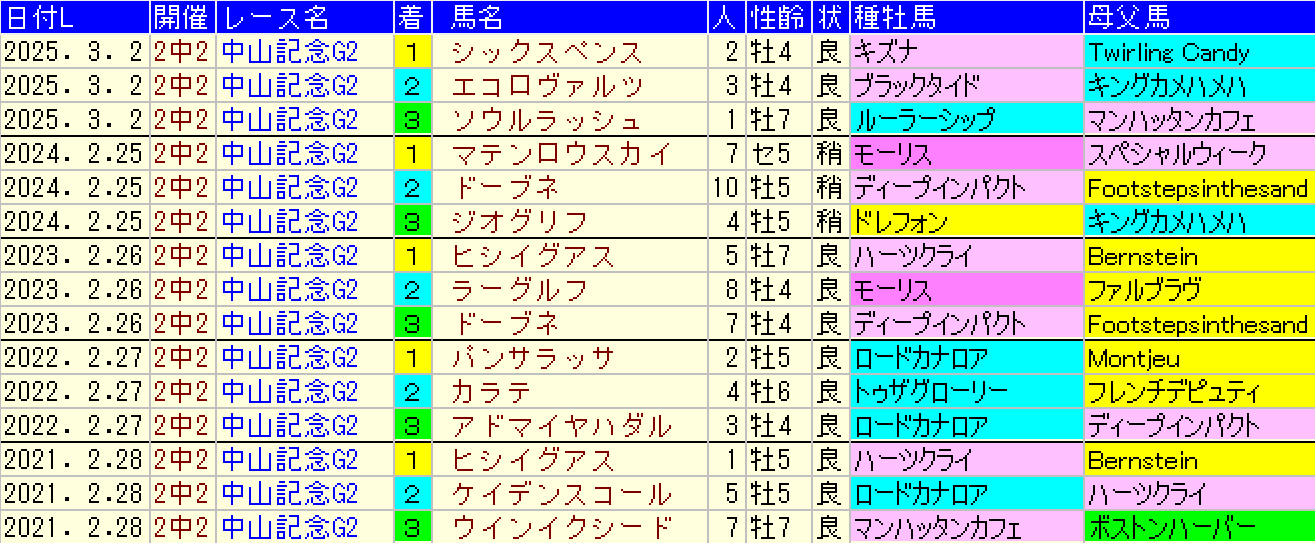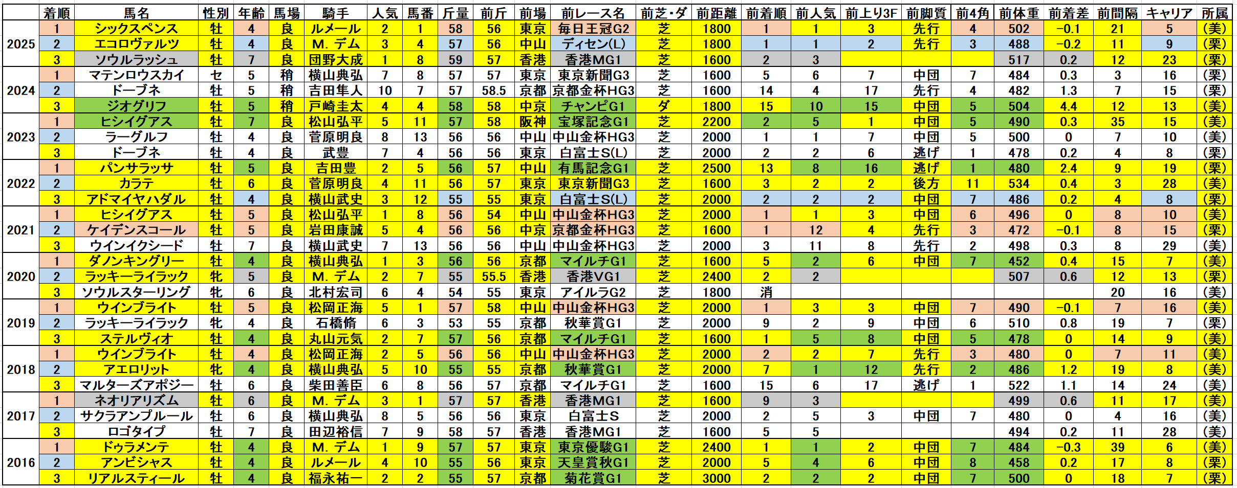 黄色部分は5番人気以内馬で、赤・青・緑・灰色部分は強調部分として色分けしています。