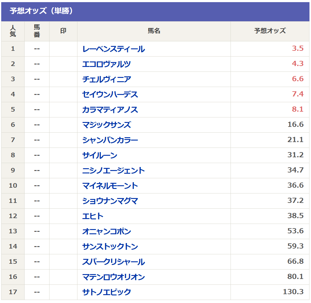 今年の上位人気を見ると名前と鞍上で売れそうなレーベンスティールとチェルヴィニアですが、人気先行で怪しくないですかね?
