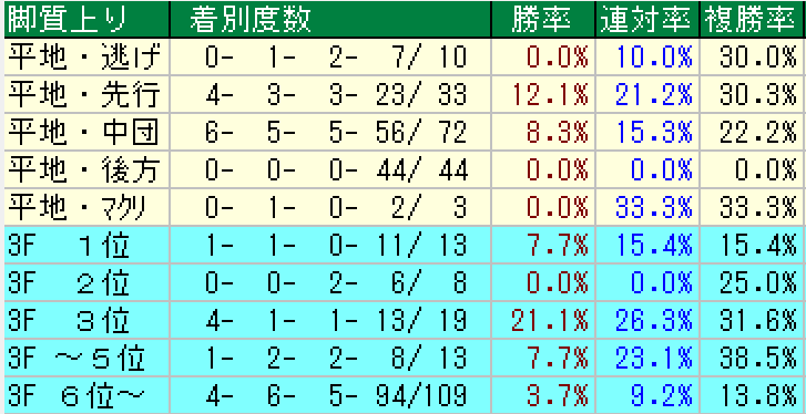 ・前走4角2~11番手以外(0・0・0・36)複勝率0%