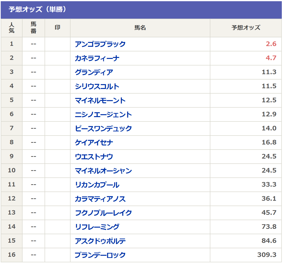 現時点の予想オッズを見ると3番人気以下が大混戦ですが、そのままアンゴラブラック・カネラフィーナ・マイネルモーント・シリウスコルト・グランディアを上位人気馬として扱います。