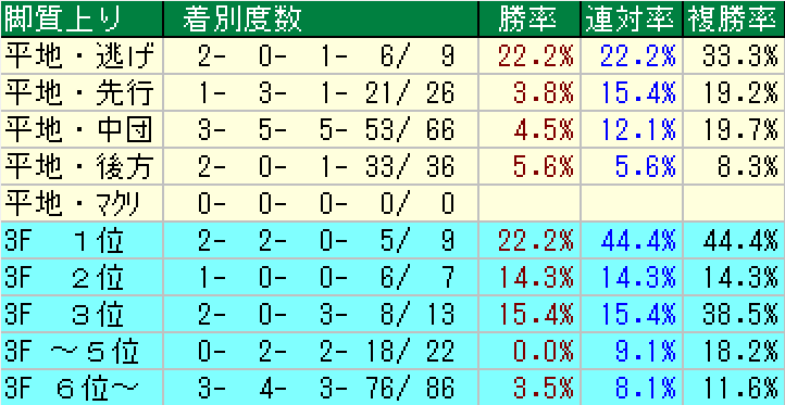 また上り6位以下でも好走数の3分の1以上を占めていて、脚質で大きな偏りは感じられない。