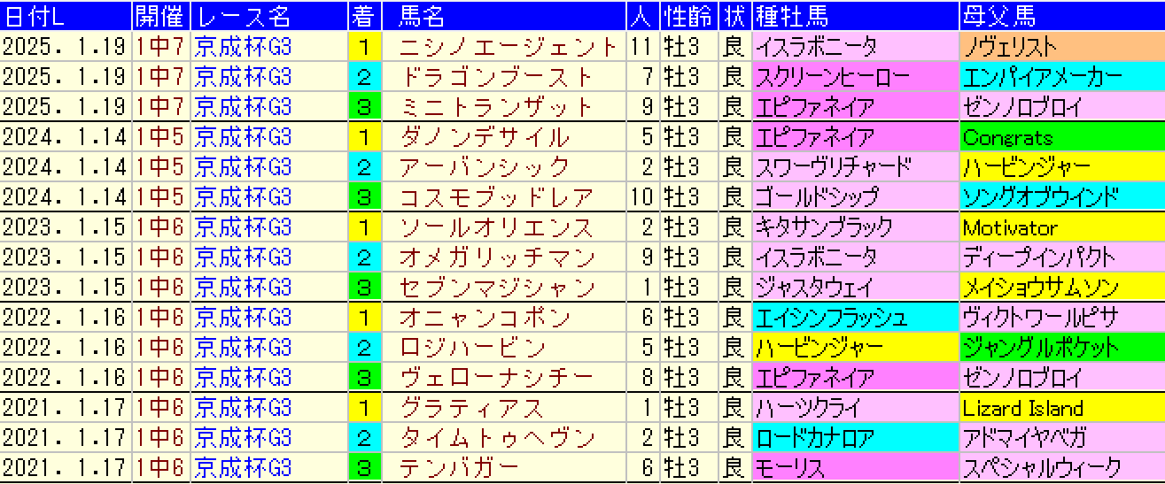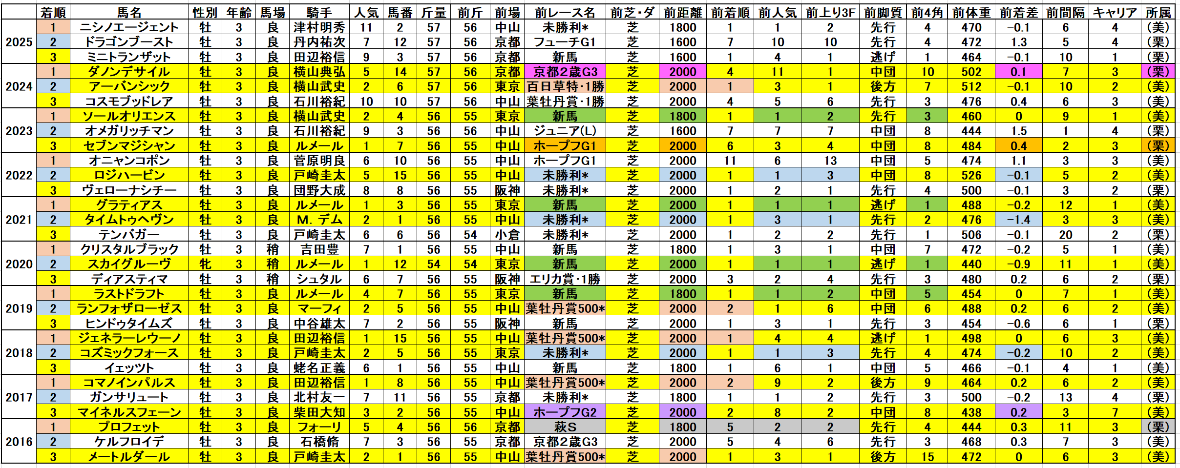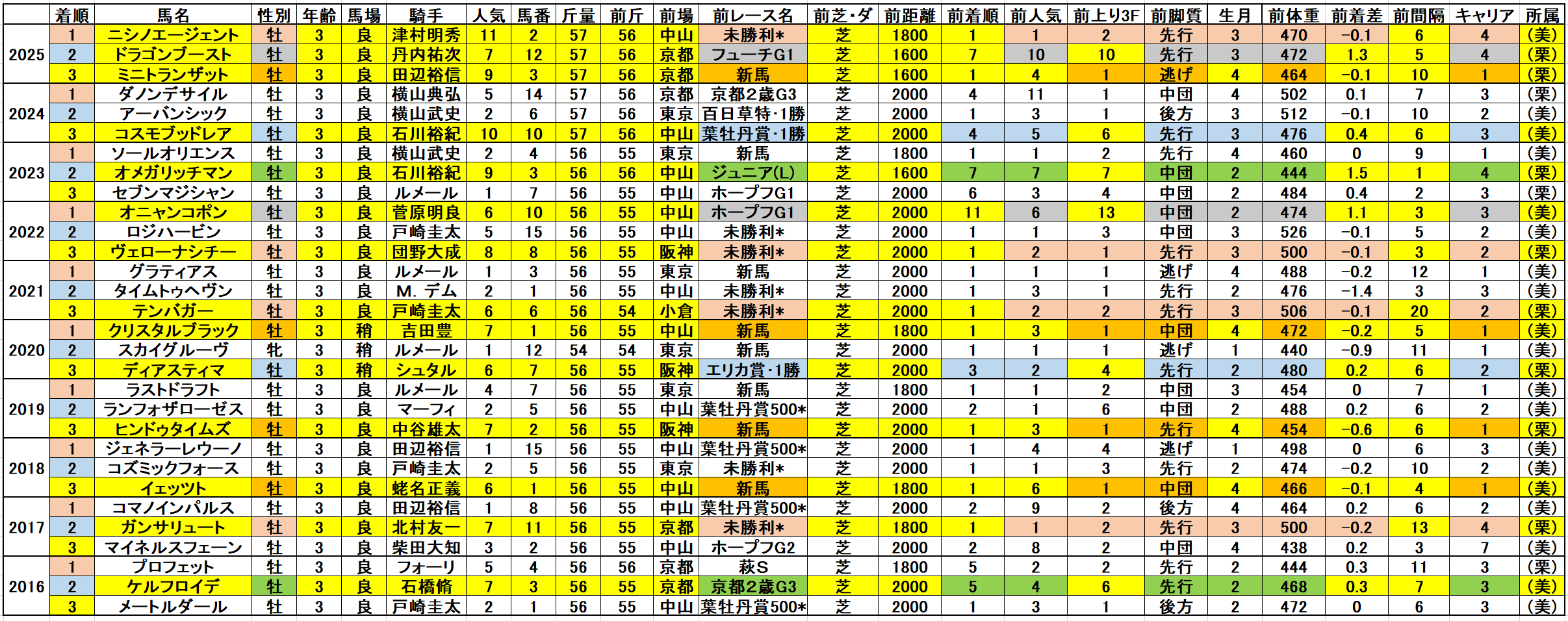 黄色部分は5番人気以内馬で、赤・青・緑・橙・紫・桃・灰色部分は強調部分として色分けしています。