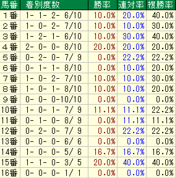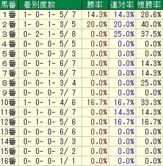 対象は過去10年の6番人気以下限定のもので、このレースの6番人気以下馬の複勝率は16,7%です。