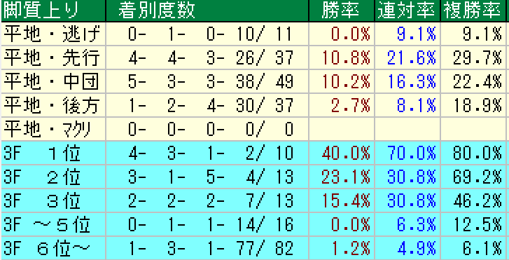 ・前走脚質追い込み(0・0・0・11)複勝率0%