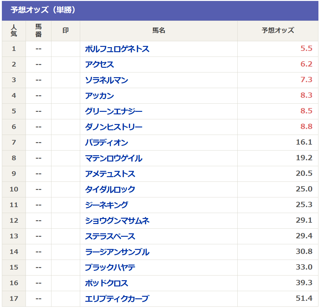 そして現在のnetkeibaさんの予想オッズは以下の通りです。