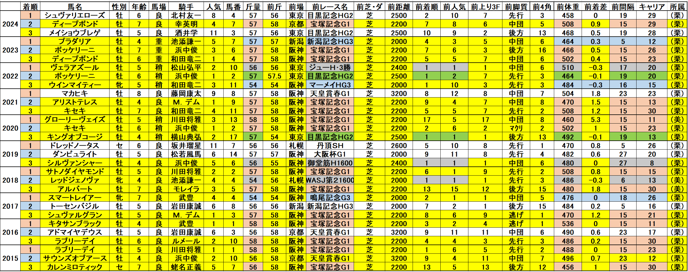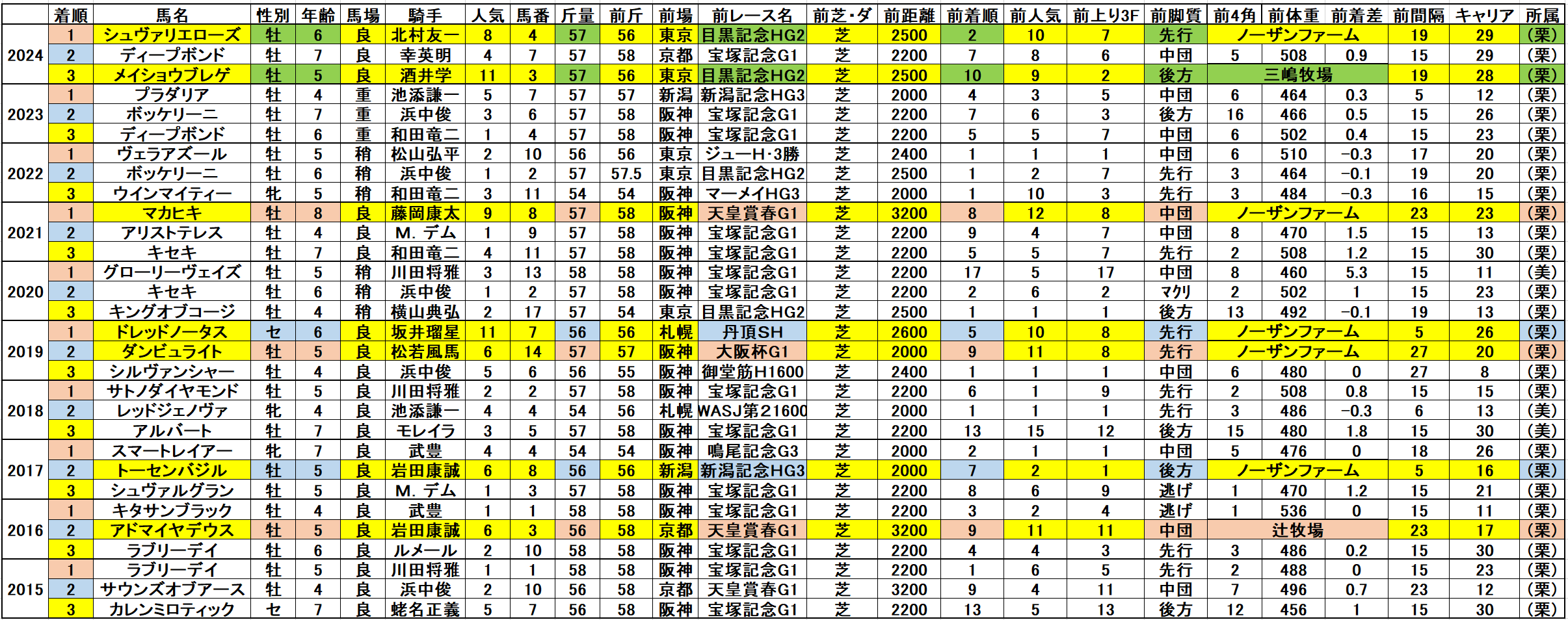 ちなみに当日5番人気以内で前走G1で宝塚記念組以外は(0・1・0・5)です。