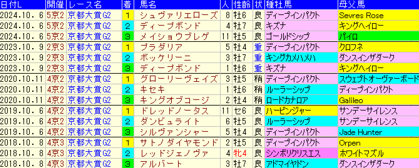 黄色部分は5番人気以内馬で、赤・青・緑・灰色部分は強調部分として色分けしています。