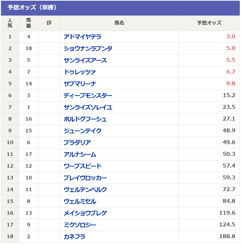 そして現在のnetkeibaさんの予想オッズは以下の通りです。