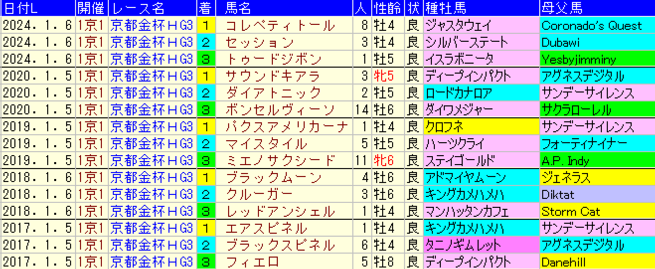 黄色部分は5番人気以内馬で、赤・青・緑・灰色部分は強調部分として色分けしています。