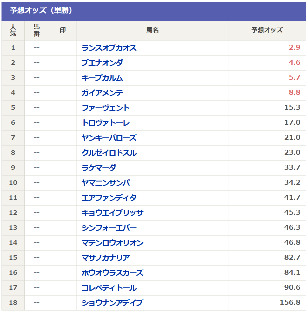 そして現在のnetkeibaさんの予想オッズは以下の通りです。