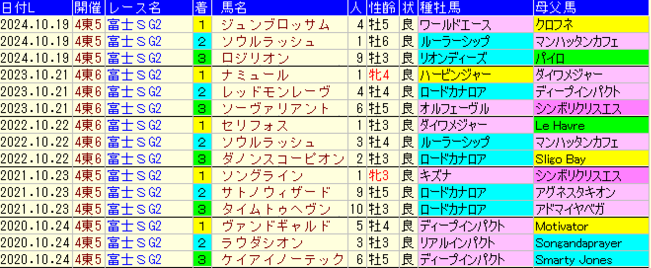黄色部分は5番人気以下馬で、赤・青・緑・灰色部分は強調部分として色分けしています。