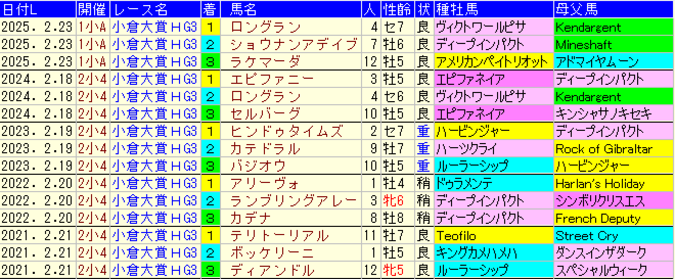 黄色部分は5番人気以内馬で、赤・青・緑色部分は強調部分として色分けしています。