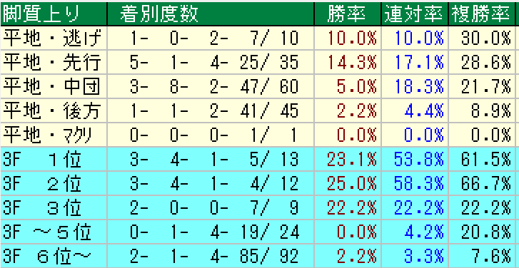 これを見ると追い込みの複勝率が悪く、好走数で言えば先行・差しが多いですね。