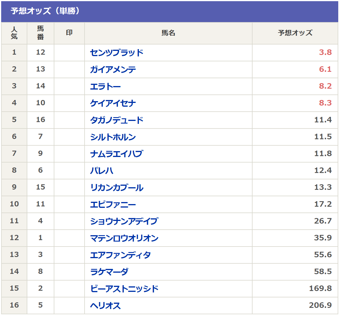 現時点の予想オッズを見ると大混戦で人気馬の区切りが難しいですが、6番人気想定のシルトホルンくらいまではソコソコ人気になりそう。